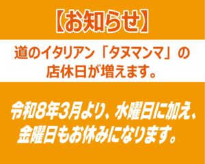 道のイタリアン「タヌマンマ」がオープン‼