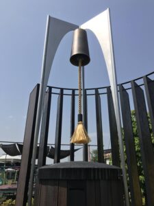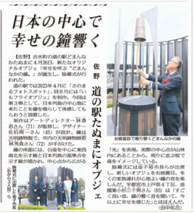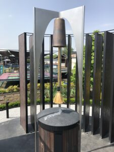 「さのまる」のフォトスポットと「いもフライ」のオブジェに続き 噴水広場に”幸せを呼ぶ「どまんなかの鐘」”が登場!! 鐘は天慶2年(939年)より1000年の歴史を持つ下野国佐野天明(栃木県佐野市)の伝統工芸「天明鋳物」です。 日本列島の中心で「幸せ」を願いながら、空へと響く美しい音色をお楽しみください。 鳴らす様子をSNSでは「#どまんなかたぬま」「#どまんなかの鐘」「#天明鋳物」「#佐野市」などのハッシュタグをつけて投稿しよう‼ 道の駅どまんなかたぬまの来場記念に鳴らしてみてね🔔